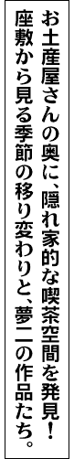 城崎の季節を感じながら、歴史・文学にふれ、美味しい珈琲を飲んで一休み。そして帰りにはお土産を…。ね、一石二鳥のスポットでしょ? |